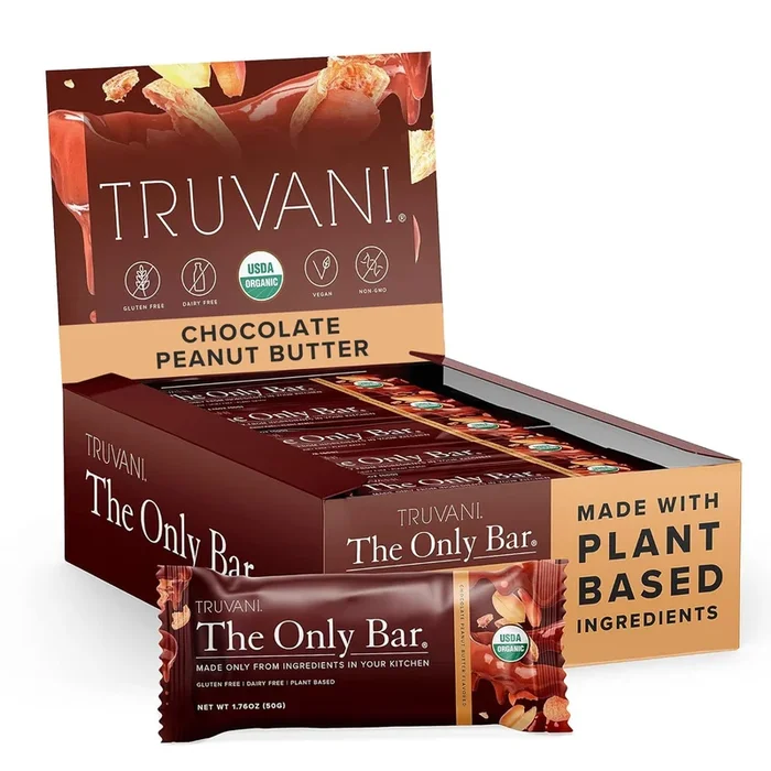 Truvani Plant Based Snack Bar | Chocolate Peanut Butter 12 Pack | 7g Protein | USDA Organic and Vegan | The Only Bar | Dairy Soy and Gluten Free | Individually Wrapped